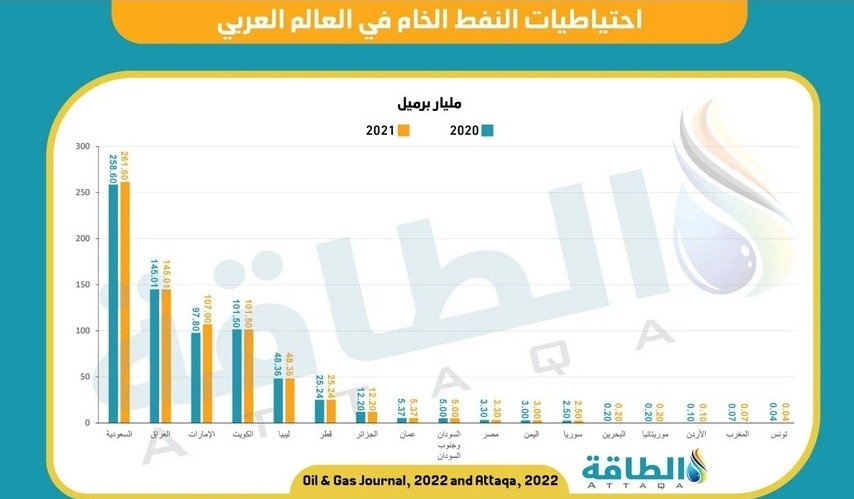 وفي الشرق الأوسط، ارتفعت احتياطيات النفط المؤكدة إلى أكثر من 860 مليار برميل في عام 2021، مقارنة بمستوى 847.83 مليار برميل عام 2020.