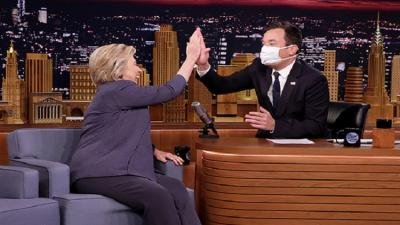 استضاف مقدم برامج التلفزيون الأمريكي المعروف جيمي فالوم في برنامجه "The Tonight Show" مرشحة الحزب الديمقراطي للانتخابات الرئاسية هيلاري كلينتون وهو يضع كمامة على وجهه.