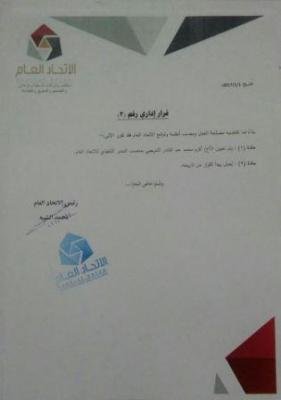أصدر الأستاذ/ محمد الشيبة رئيس الاتحاد العام لوكالات وشركات ومؤسسات الدعاية والإعلان والطباعة والتسويق قرارا إداريا ونقابيا رقم (3) لسنة2017م بتاريخ 1/1/2017م، قضت المادة الأولى بتعيين الأخ /أكرم محمد عبد القادر الشرجبي مديرا تنفيذيا للاتحاد العام وذلك استنادا إلى أحكام النظام والقانون والإشهار رقم (708) لسنة 2015م .