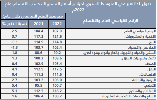 وفي المقابل، انخفضت أسعار الملابس والأحذية خلال عام 2022 بنسبة 1.3%؛ متأثرا بانخفاض أسعار الملابس بنحو 0.9%، وتراجعت أسعار التبغ بنسبة 0.1%.