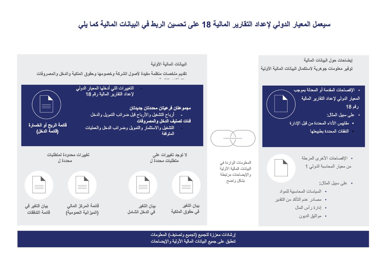 ينطبق المعيار الدولي لإعداد التقارير المالية رقم 18 عالميًا على البيانات المالية المعدة بموجب المعايير الدولية لإعداد التقارير المالية، ويوفر إطارًا يدعم المعايير والتفسيرات الأخرى في تقديم رؤية شاملة للإفصاحات المالية، ولا تملي قواعد الاعتراف أو القياس؛ تظل تلك ضمن نطاق المبادئ التوجيهية المحددة للمعايير الدولية لإعداد التقارير المالية.