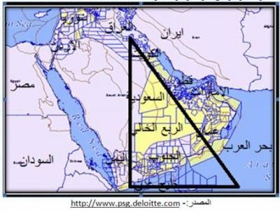 وهذه البحيرة النفطية تشكل حوضا رسوبيا كبيرا يمتد رأسيا على هيئة مثلث قاعدة في أرضي محافظات الجنوب (شبوة – حضرموت – والمهرة) ورأسه في جنوب العراق، (أنظر الخريطة رقم (1)). وتدخل ضمن هذا الحوض النفطي الكبير، أحواض فرعية متعددة ومتباينة في مساحتها وتقديرات حجم المخزون النفطي فيها، في كل من سلطنة عمان والأمارات العربية المتحدة ودولة قطر ومملكة البحرين ودولة الكويت، فضلا عن المخزون الاحتياطي الهائل في المملكة العربية السعودية والمقدر بحوالي 267 مليار برميل (42 مليار متر مكعب)، وهذا المخزون وحده سيكفي لمدة 100 عام من الإنتاج السعودي، كما جاء في تصريحات مساعد وزير البترول والثروة المعدنية السعودي الأمير عبد العزيز بن سلمان، البالغ ما بين 9 – 12,5 مليون برميل يوميا (1).