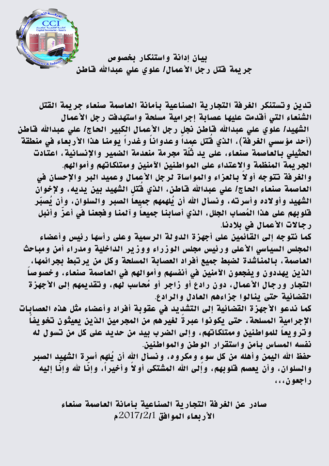 ادانت الغرفة التجارية الصناعية بأمانة العاصمة صنعاء جريمة القتل الشنعاء التي أقدمت عليها عصابة إجرامية مسلحة استهدفت رجل الأعمال الشهيد/ علوي علي عبدالله قاطن نجل رجل الأعمال الكبير الحاج/ علي عبدالله قاطن (أحد مؤسسي الغرفة)، الذي قُتل عمداً وعدواناً وغدراً يوم الأربعاء الماضي في منطقة الحثيلي بالعاصمة صنعاء، على يد ثُلّة مجرمة منعدمة الضمير والإنسانية، اعتادت الجريمة المنظمة والاعتداء على المواطنين الآمنين وممتلكاتهم وأموالهم.