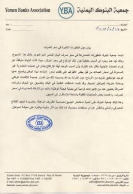 أكدت جمعية البنوك اليمنية أنه لا يوجد أية أسباب حقيقية تبرر الارتفاع في سعر الدولار؛ حيث كانت البنوك متوقفة عن شراء العملات الأجنبية خلال الفترة.
