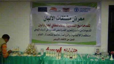 كما تضمنت الورشة ، بحضور عدد من مدراء عموم مكاتب التخطيط والتعاون الدولي بمحافظات المهرة وسقطرى وتعز والحديدة والبيضاء ومأرب والجوف وعدد من المستفيذين بمحافظات ابين ولحج ،معرض لمشتقات الألبان للمجاميع النسوية بمحافظتي لحج وأبين المدعومة من مشروع تعزيز القدرة على الصمود في الريف اليمني بتنفيذ منظمة الأغذية والزراعة للأمم المتحدة "الفاو" بتمويل من الاتحاد الأوروبي .