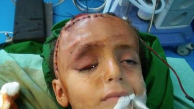 وقالت مصادر طبية ان الطفل "مؤيد محمد هزاع " ثلاث سنوات دخل الى غرفة العمليات بعد تعرضه لكسور متعددة في الجمجمة منها كسر جبهي متسع يمتد حتى سقف كرة العين وقاعدة الجمجمة.