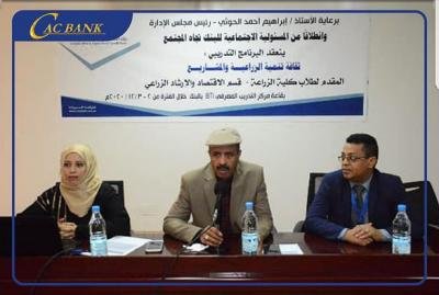 نظم بنك التسليف التعاوني والزراعي، يوم الأربعاء الموافق 2020/12/2 بقاعة التدريب- مبنى الإدارة العامة، الدورة التدريبية لطلاب كلية الزراعة، قسم الاقتصاد والإرشاد الزراعي في جامعة صنعاء، بعنوان: "ثقافة التنمية الزراعية والمشاريع"، التي استمرت ليومين، وبشكل مكثف.