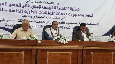 جاء ذلك في اللقاء التقييمي لإعلان نتائج المسح الميداني لمستوى جودة خدمات المنشئات الطبية الخاصة المرحلة الثانية على مستوى الجمهورية الذي عقده وزير الصحة العامة والسكان برعاية مدير مكتب رئاسة الجمهورية احمد حامد الذي فاجأ الحضور بثقافته العالية والمامه الواسع بمشاكل وزارة الصحة وهمومها وطموحاتها.