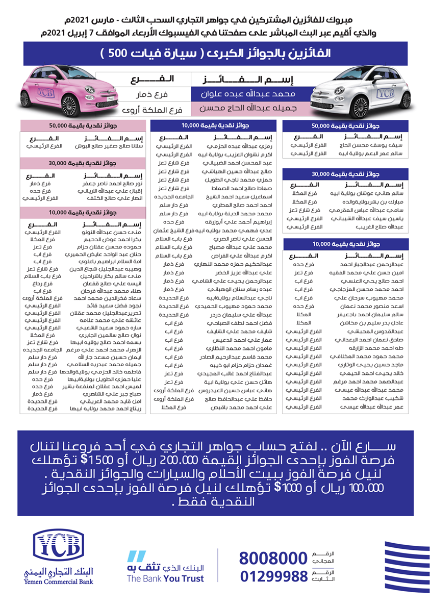 أما سيارتي فيات 500 في سحب شهر مارس 2021 فكانتا من نصيب المشارك محمد عبدالله عبده علوان من فرع ذمار ، والمشاركة جميله عبدالله الحاج محسن من فرع الملكة اروى ، إلى جانب السحب على مئات الجوائز النقدية للأشهر الثلاثة على المشاركين في برنامج جواهر التجاري ، وتم توريدها إلى حساباتهم مباشرة.